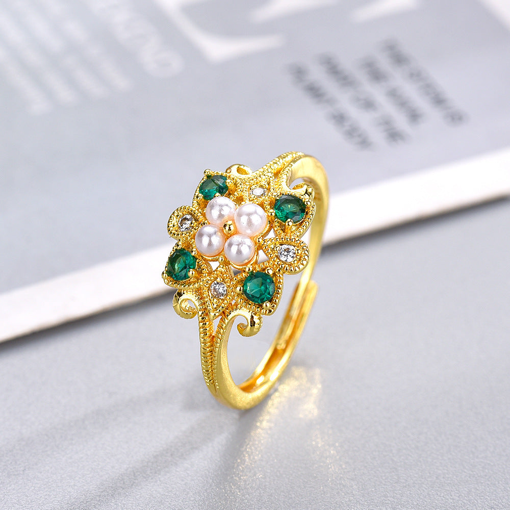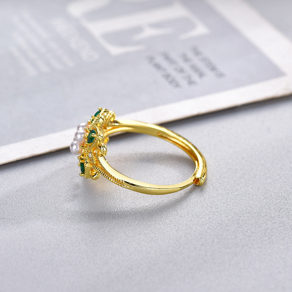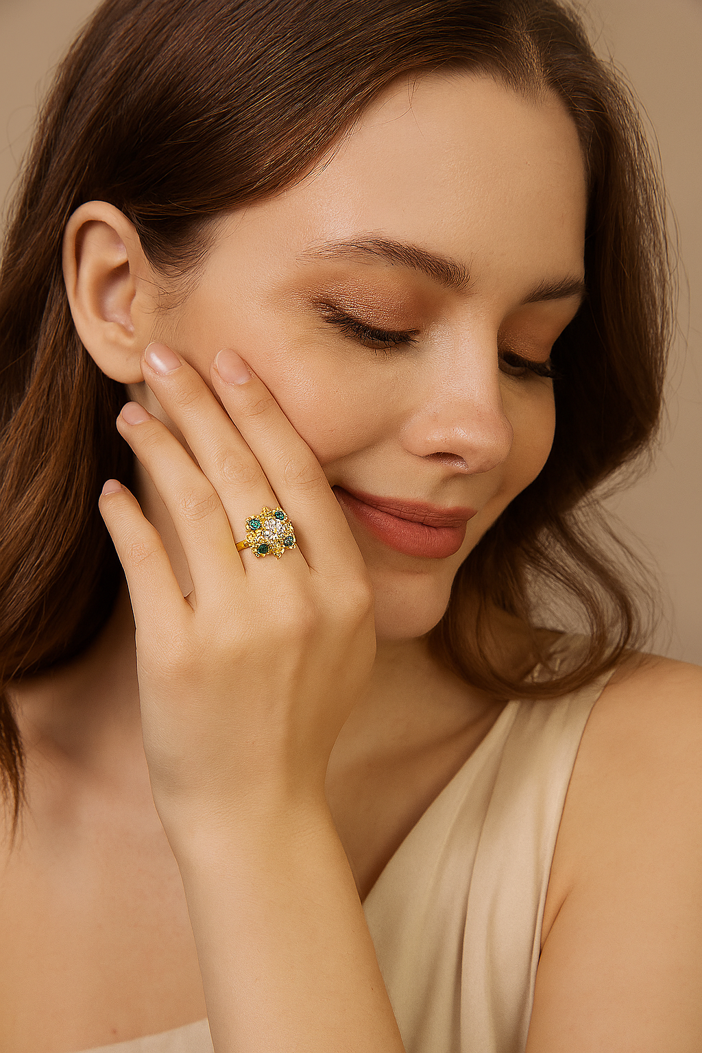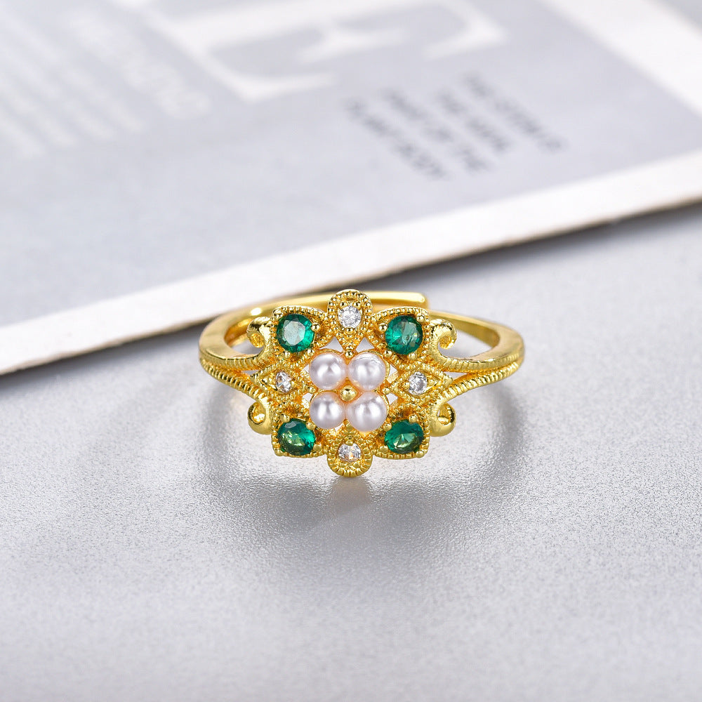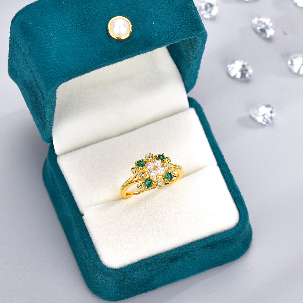 Verleihe deinem Look eine royale Note mit Aurélienne – einem meisterhaft gestalteten Ring, der barocke Pracht mit floraler Zartheit verbindet. In der Mitte erblüht ein zartes Bouquet aus schimmernden Perlen, umrahmt von smaragdgrünen und kristallklaren Akzenten. Die filigrane Goldfassung sorgt für einen Hauch von Vintage-Luxus – perfekt für alle, die das Besondere lieben.