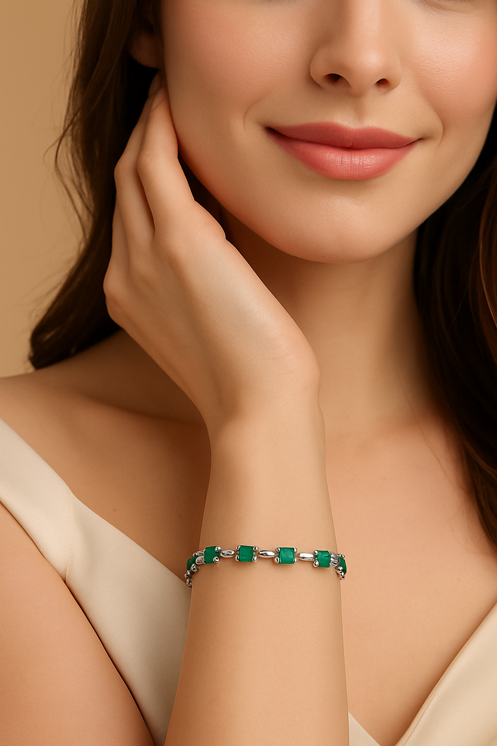 Zeitlos schön und stilvoll – das Silver Ivy Armband vereint natürliche Eleganz mit modernem Chic. Die feinen, smaragdgrünen Steine werden von filigranen Silbergliedern eingefasst und schmiegen sich sanft ums Handgelenk.