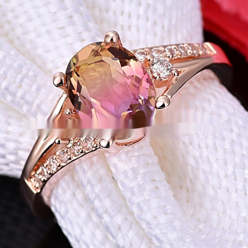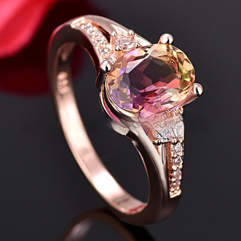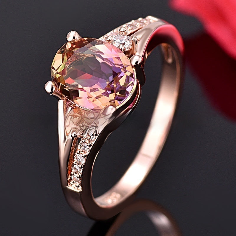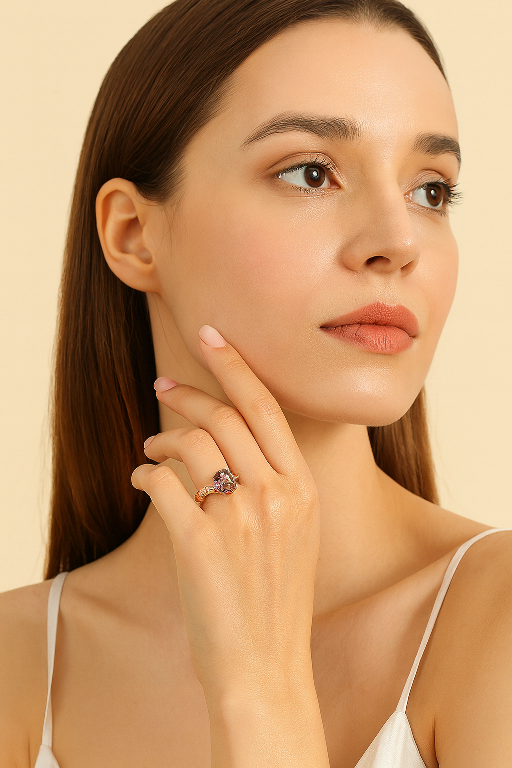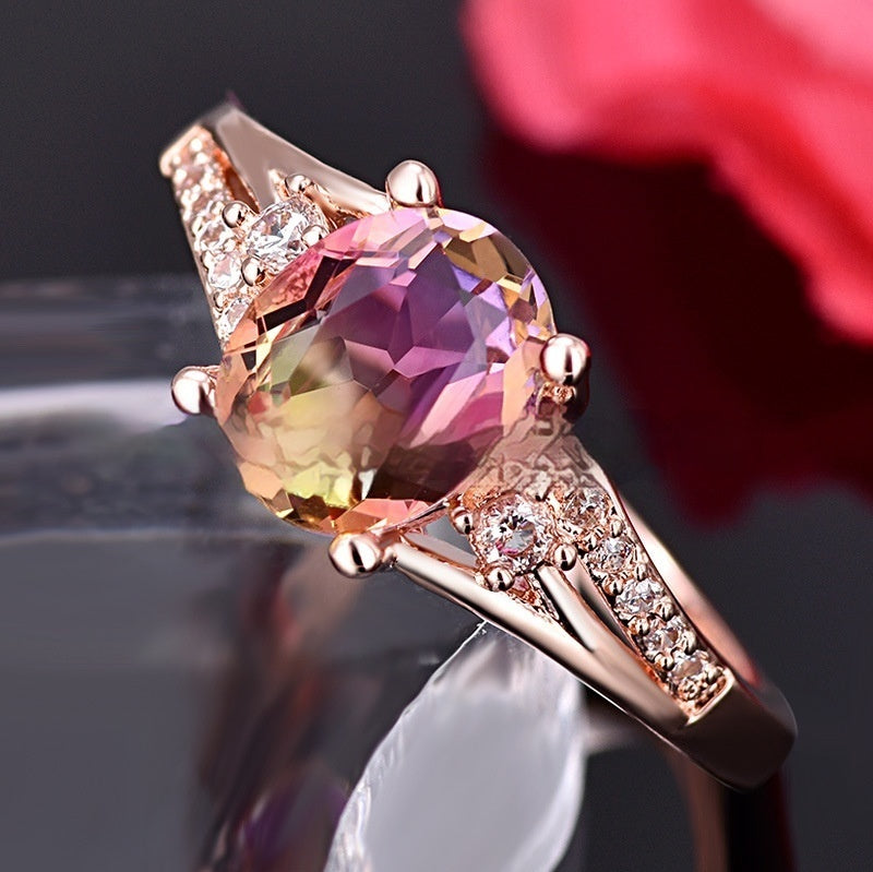 Der Twilight Aura Ring vereint einen faszinierenden, facettierten Mittelstein in schimmernden Rosé-, Gold- und Lavendeltönen mit einer eleganten roségoldenen Fassung. Funkelnde Akzentsteine entlang der Ringschiene sorgen für zusätzlichen Glanz – ein Ring wie gemacht für Träumerinnen mit Stil.